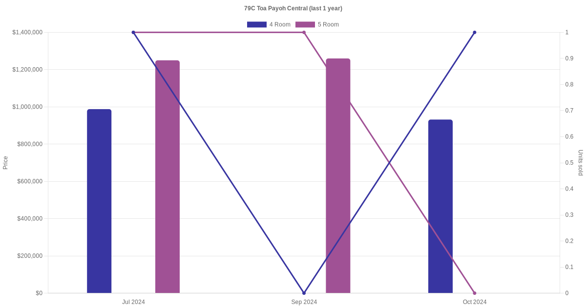 Below is a quick summary of the resale transactions volume and average price trends for the 4 room and 5 room units at 79C Toa Payoh Central.