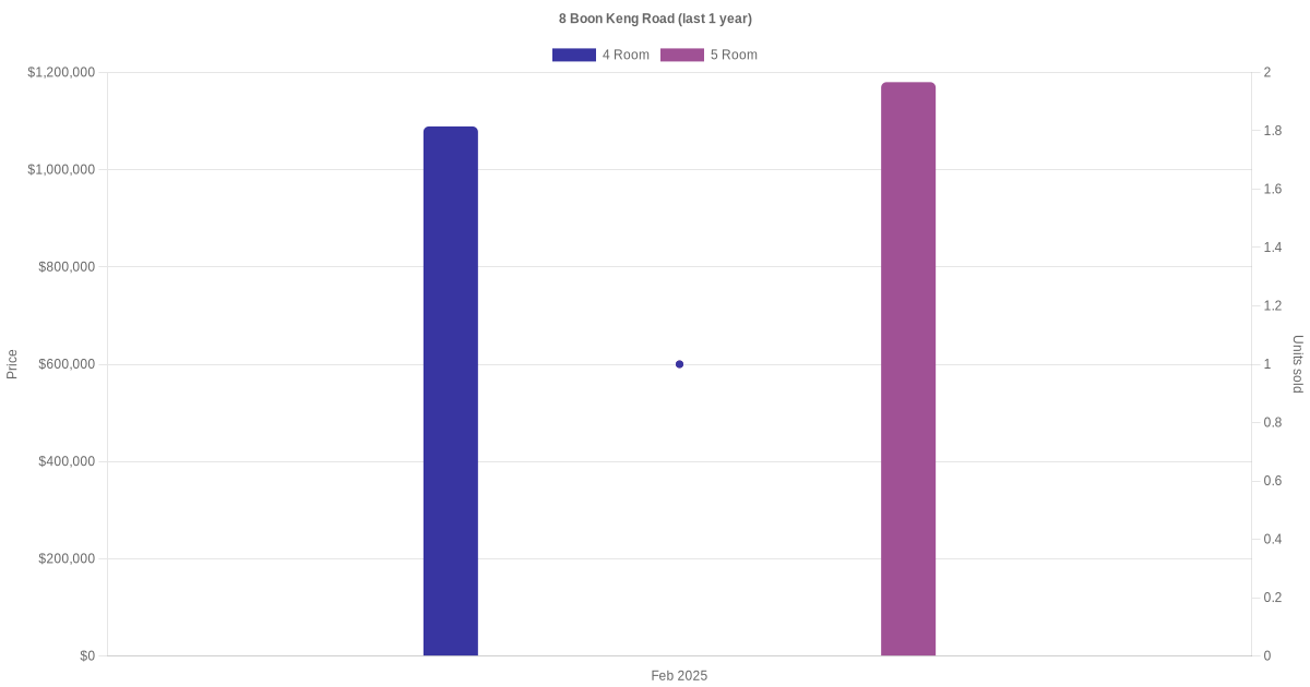 There were a total of 21 resale transactions in the last 3 years for units in block 8 Boon Keng Road, with the latest one recorded in Dec 2025.
