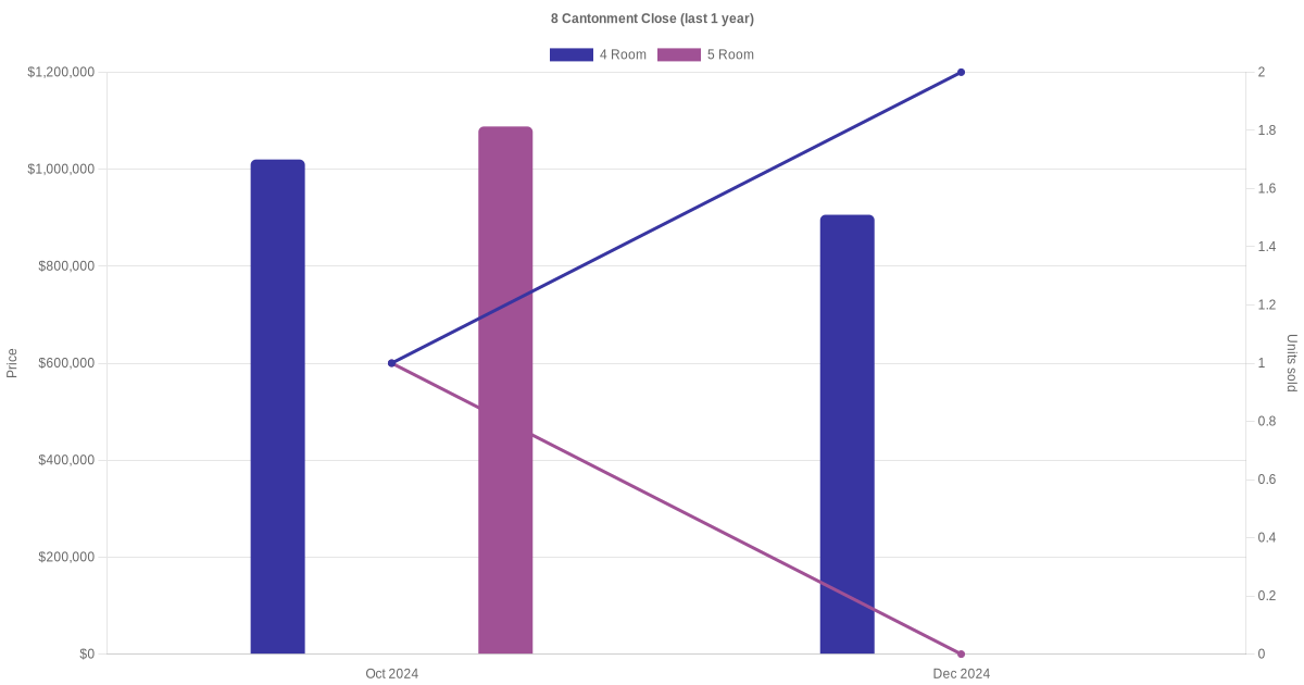 Below is a quick summary of the resale transactions volume and average price trends for the 3 room, 4 room and 5 room units at 8 Cantonment Close.