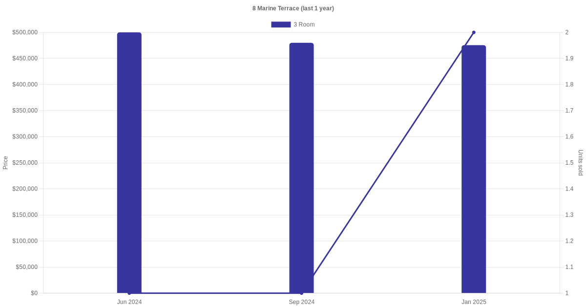 Below is a quick summary of the resale transactions volume and average price trends for the 3 room and 5 room units at 8 Marine Terrace.