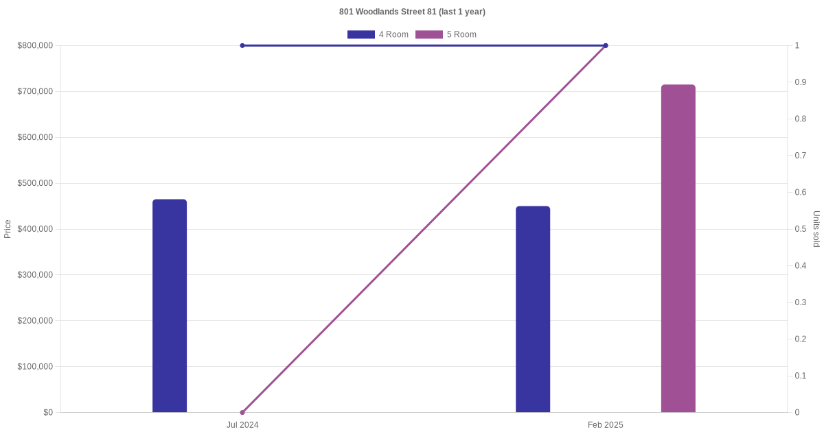 There were a total of 5 resale transactions in the last 3 years for units in block 801 Woodlands Street 81, with the latest one recorded in Feb 2025.