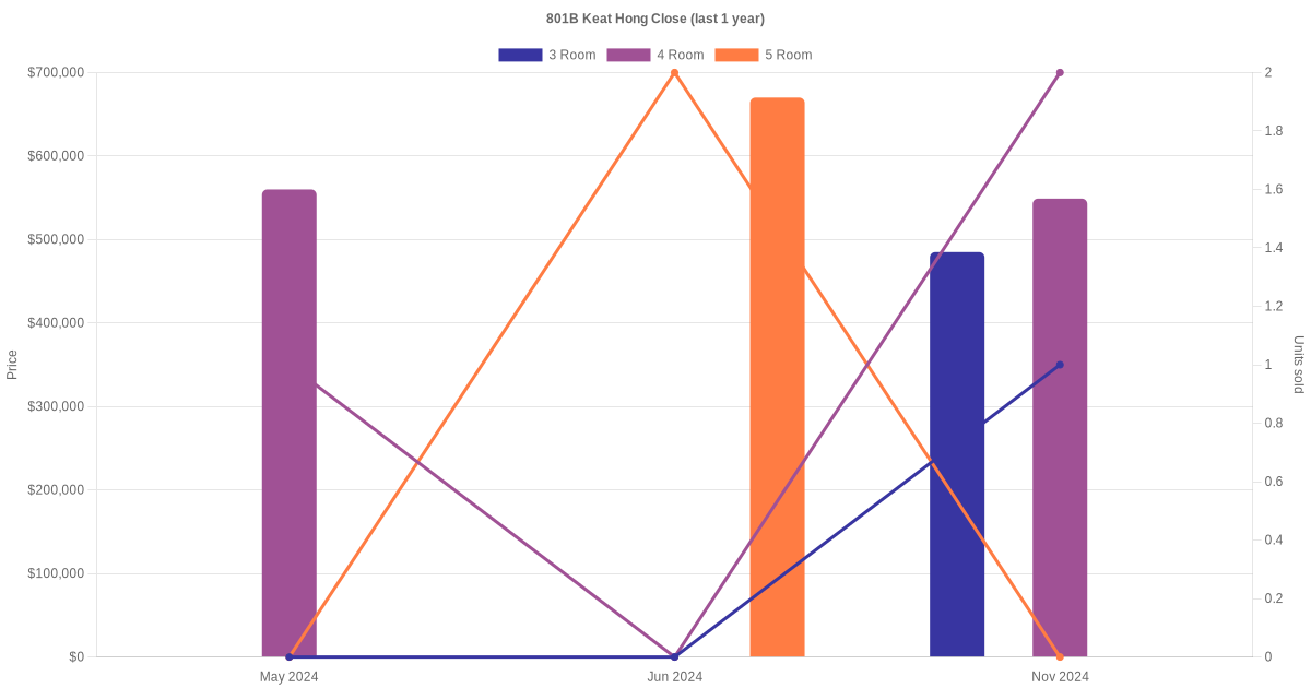 Below is a quick summary of the resale transactions volume and average price trends for the 3 room, 4 room and 5 room units at 801B Keat Hong Close.