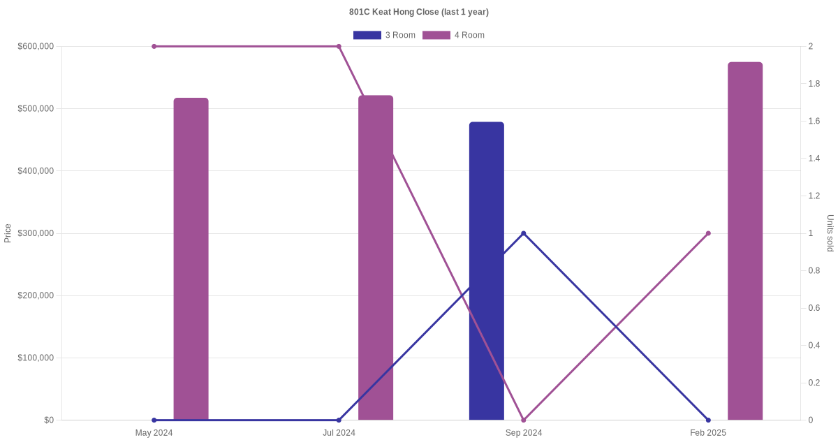 Below is a quick summary of the resale transactions volume and average price trends for the 3 room and 4 room units at 801C Keat Hong Close.