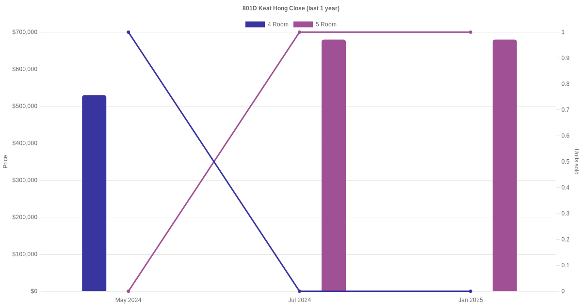 Below is a quick summary of the resale transactions volume and average price trends for the 4 room and 5 room units at 801D Keat Hong Close.