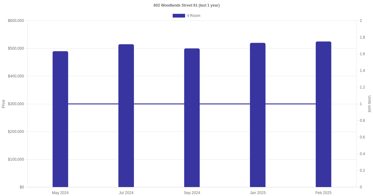 Below is a quick summary of the resale transactions volume and average price trends for the 4 room units at 802 Woodlands Street 81.
