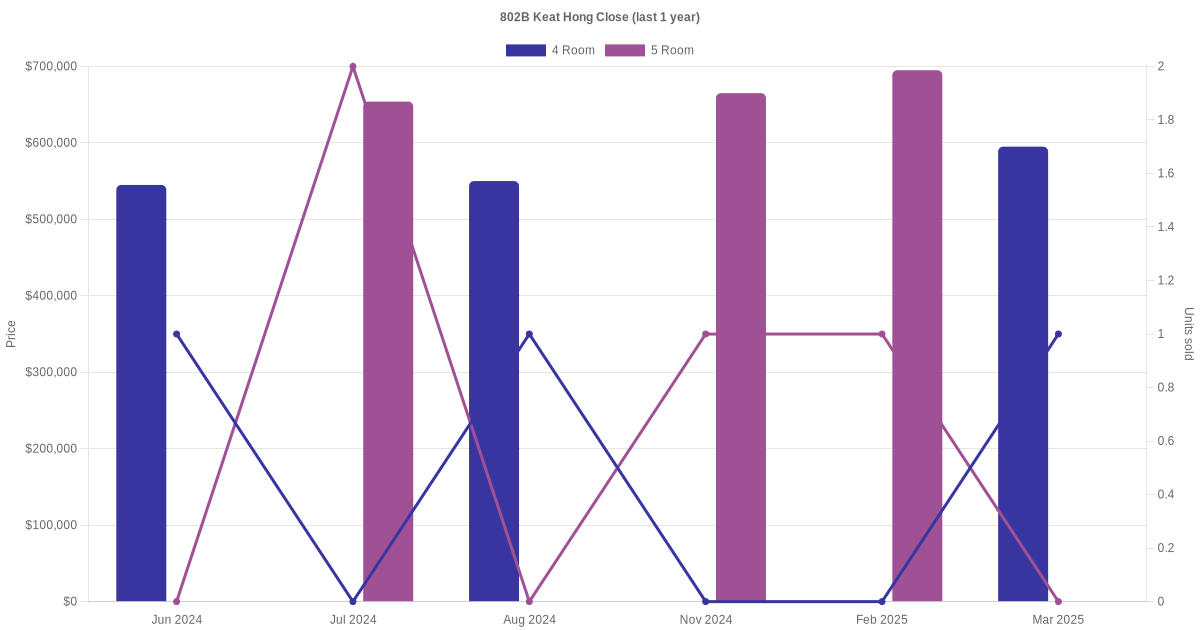 Below is a quick summary of the resale transactions volume and average price trends for the 4 room and 5 room units at 802B Keat Hong Close.