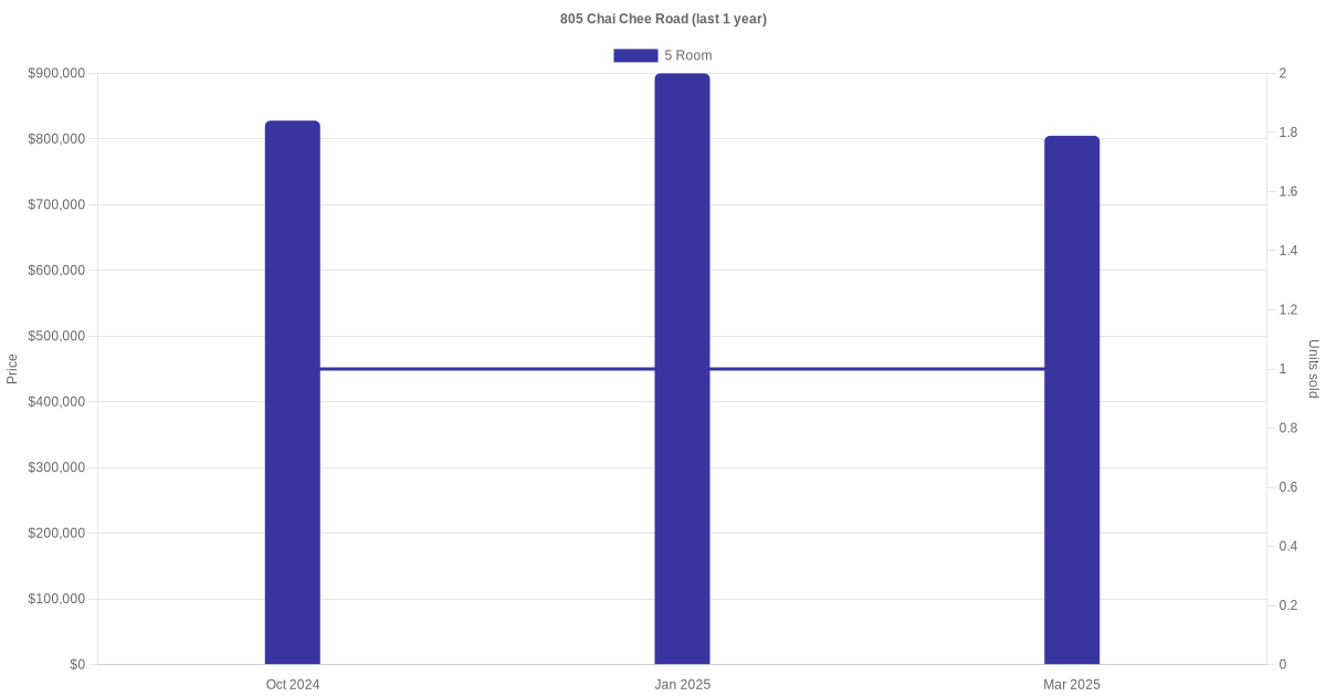 Below is a quick summary of the resale transactions volume and average price trends for the 5 room units at 805 Chai Chee Road.