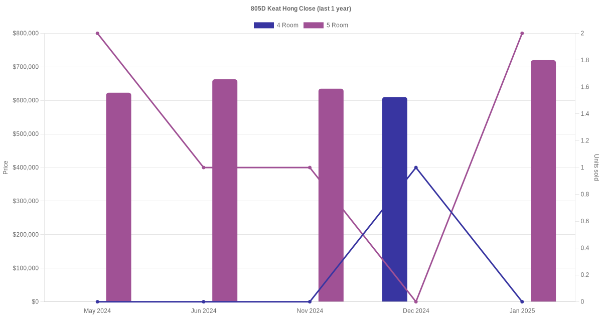 Below is a quick summary of the resale transactions volume and average price trends for the 4 room and 5 room units at 805D Keat Hong Close.