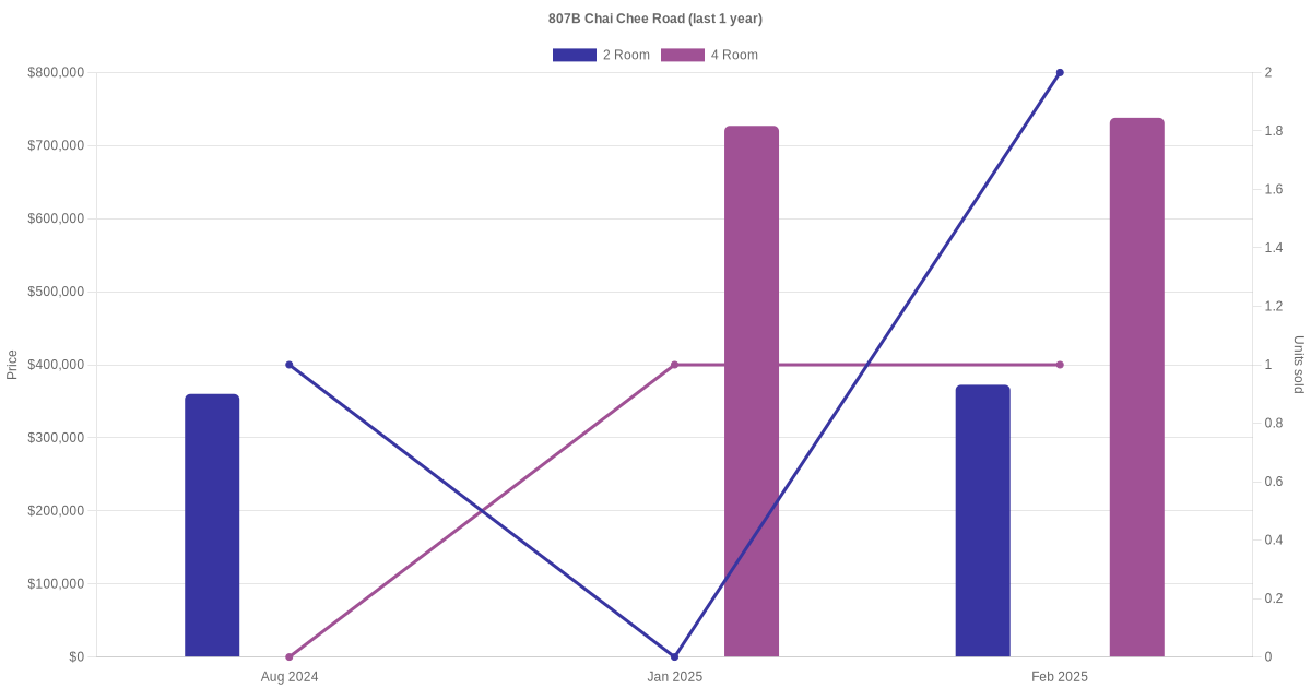 Here's a summary of the rental transactions and price trends for the 2 room, 3 room and 4 room units at 807B Chai Chee Road.