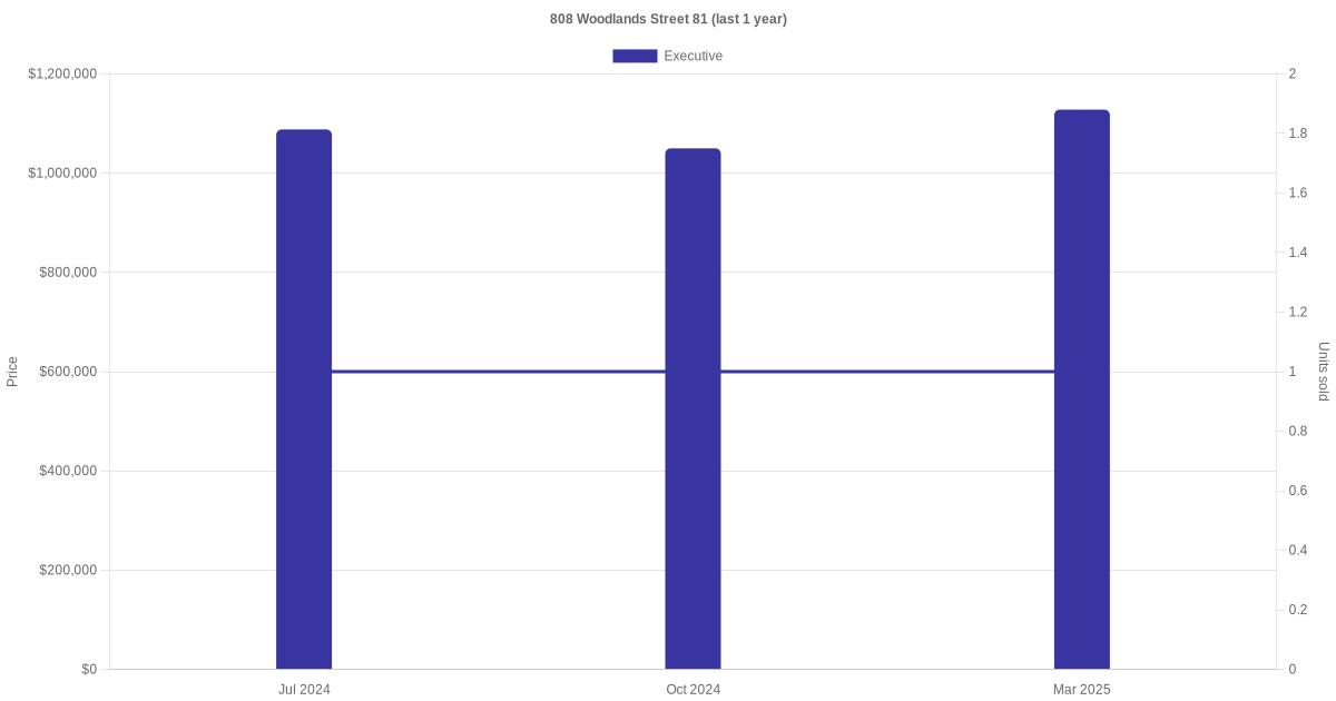 | Mar 2025 | $1,128,000 | $5,875 | Executive | Blk 808 Woodlands Street 81 Executive / 192 sqm | 10 to 12 | 192 sqm | Apartment | 1994 |