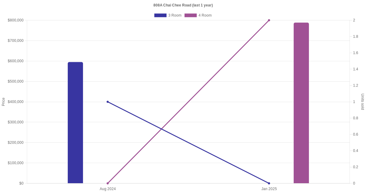 Below is a quick summary of the resale transactions volume and average price trends for the 3 room and 4 room units at 808A Chai Chee Road.