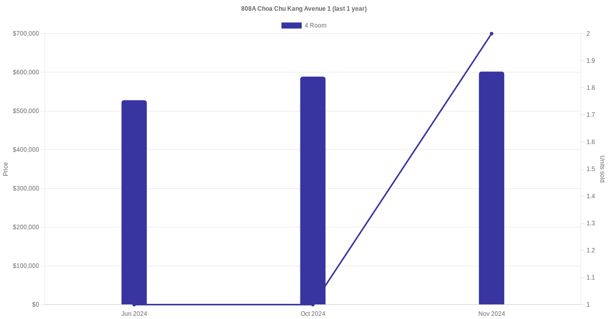 Below is a quick summary of the resale transactions volume and average price trends for the 4 room and 5 room units at 808A Choa Chu Kang Avenue 1.