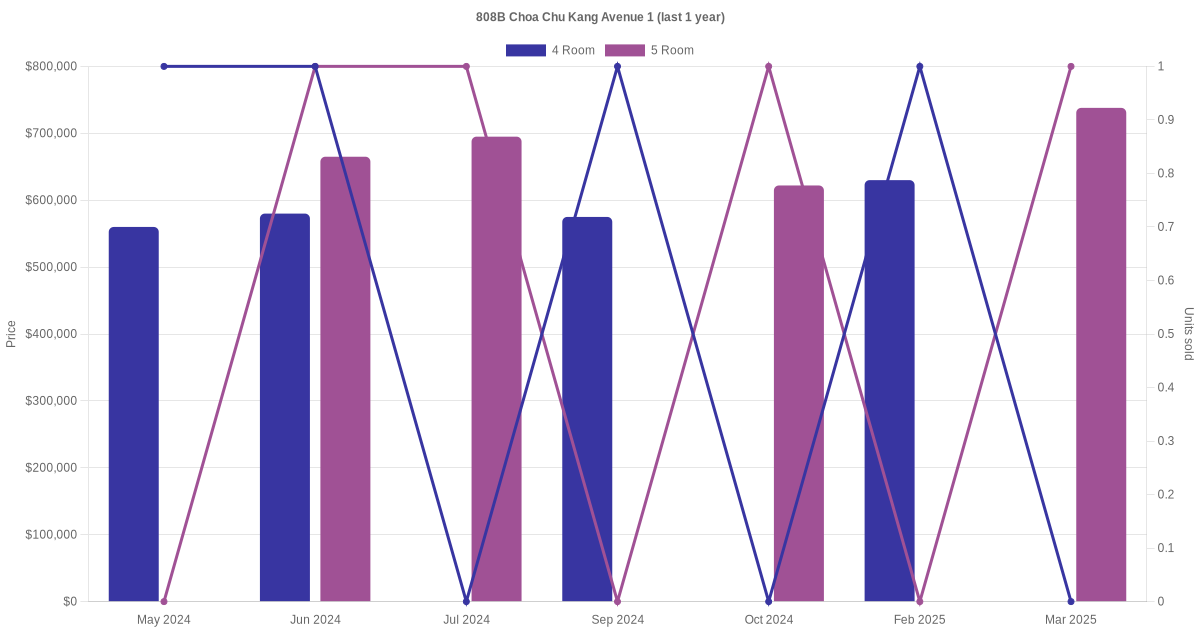 Below is a quick summary of the resale transactions volume and average price trends for the 4 room and 5 room units at 808B Choa Chu Kang Avenue 1.