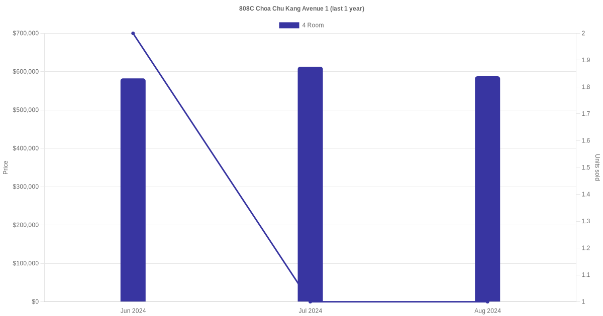 Below is a quick summary of the resale transactions volume and average price trends for the 4 room and 5 room units at 808C Choa Chu Kang Avenue 1.