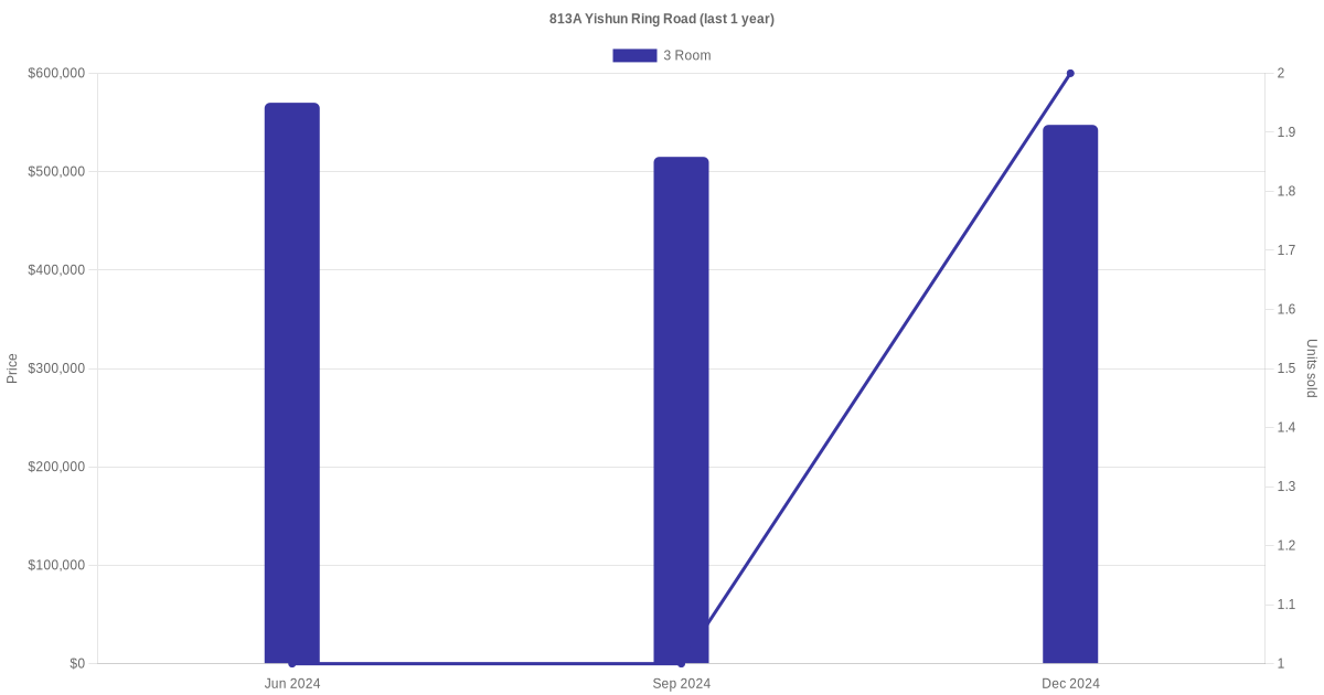 Below is a quick summary of the resale transactions volume and average price trends for the 3 room units at 813A Yishun Ring Road.