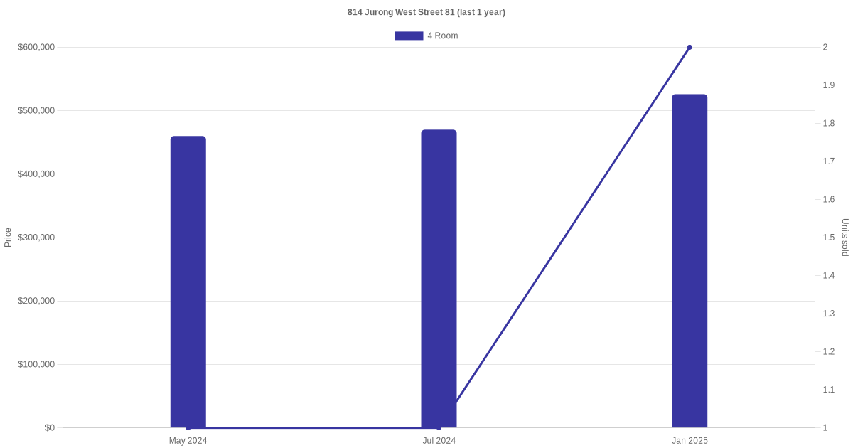 Below is a quick summary of the resale transactions volume and average price trends for the 4 room units at 814 Jurong West Street 81.