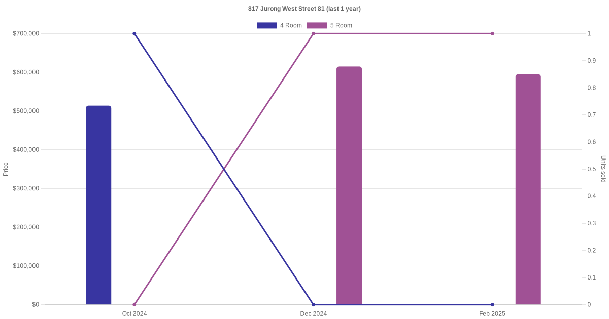 Below is a quick summary of the resale transactions volume and average price trends for the 4 room and 5 room units at 817 Jurong West Street 81.