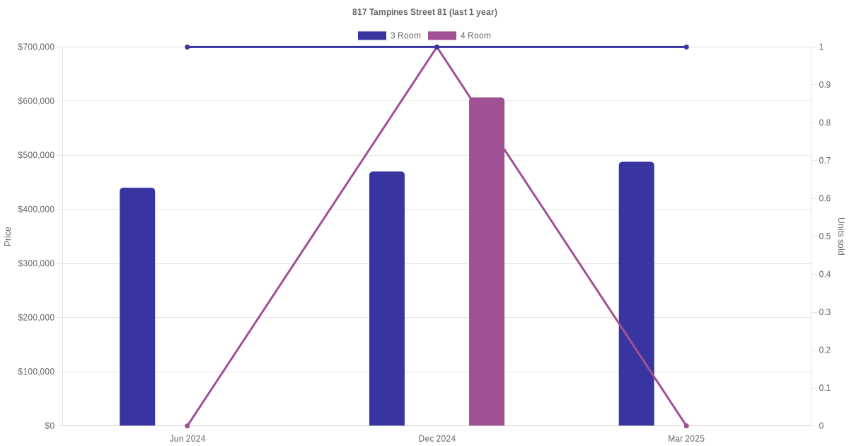 Below is a quick summary of the resale transactions volume and average price trends for the 3 room and 4 room units at 817 Tampines Street 81.