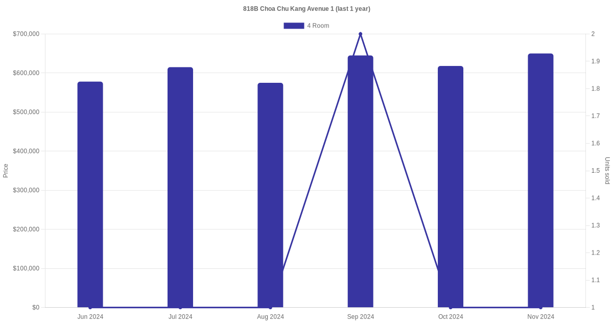 Below is a quick summary of the resale transactions volume and average price trends for the 4 room units at 818B Choa Chu Kang Avenue 1.