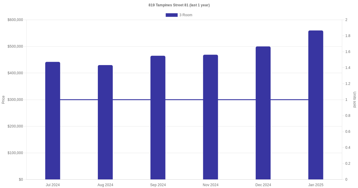 | Jan 2025 | $2,700 | 3 Room | Blk 819 Tampines Street 81 3 Room | Tampines |