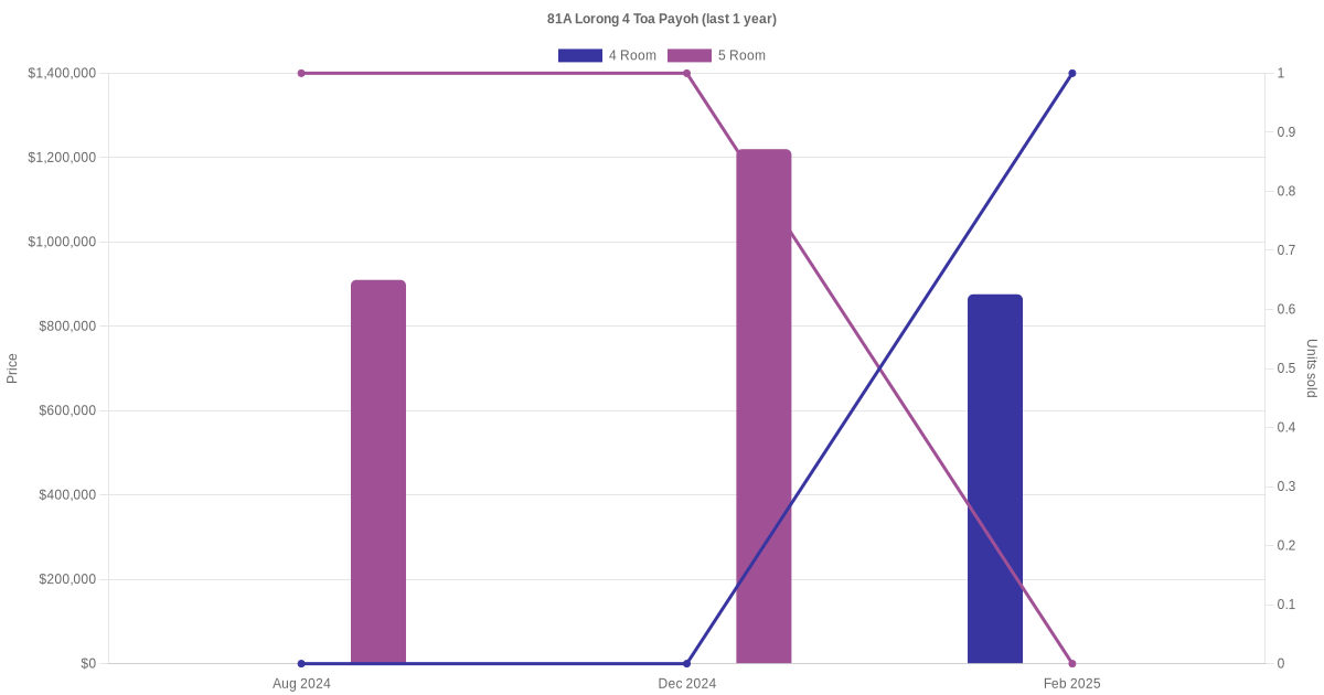 There were a total of 4 resale transactions in the last 3 years for units in block 81A Lorong 4 Toa Payoh, with the latest one recorded in Apr 2025.