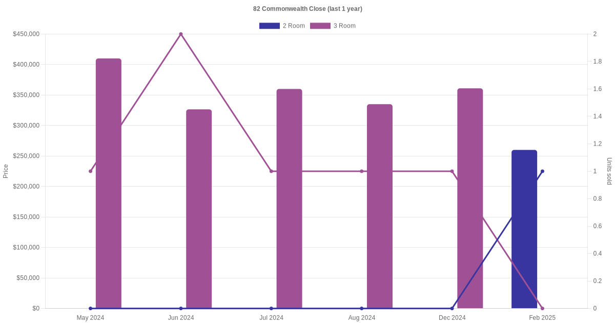 Below is a quick summary of the resale transactions volume and average price trends for the 2 room and 3 room units at 82 Commonwealth Close.