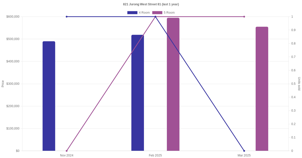 Below is a quick summary of the resale transactions volume and average price trends for the 4 room and 5 room units at 821 Jurong West Street 81.
