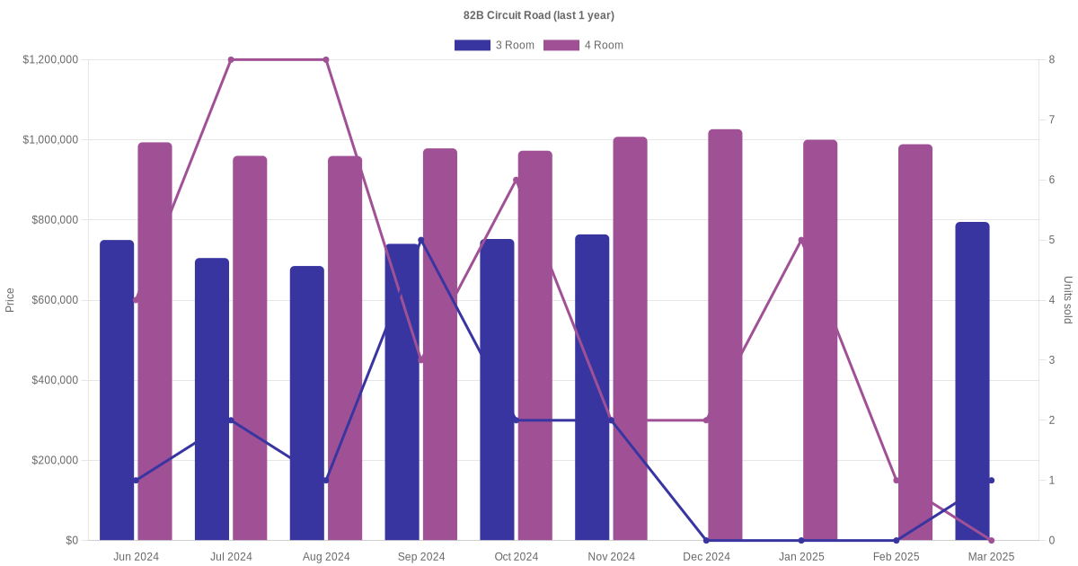Below is a quick summary of the resale transactions volume and average price trends for the 3 room and 4 room units at 82B Circuit Road.