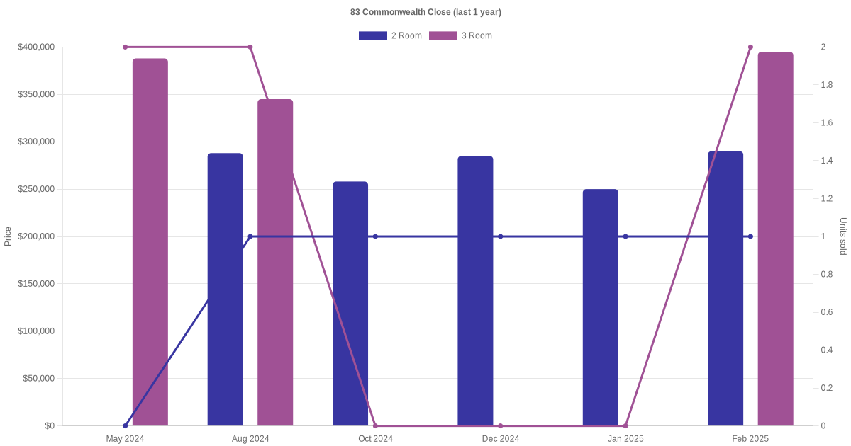 Below is a quick summary of the resale transactions volume and average price trends for the 2 room and 3 room units at 83 Commonwealth Close.