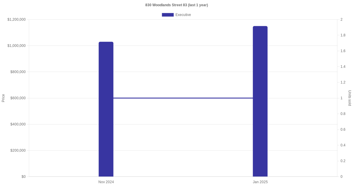 | Jan 2025 | $1,150,000 | $5,990 | Executive | Blk 830 Woodlands Street 83 Executive / 192 sqm | 10 to 12 | 192 sqm | Apartment | 1994 |