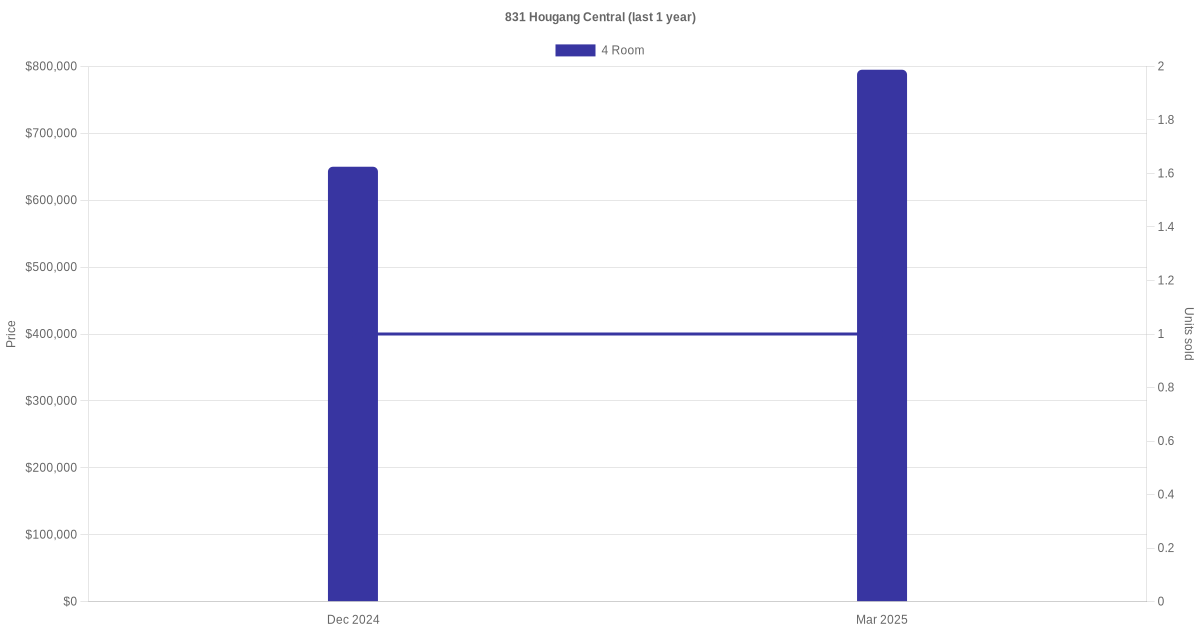 Below is a quick summary of the resale transactions volume and average price trends for the 4 room units at 831 Hougang Central.