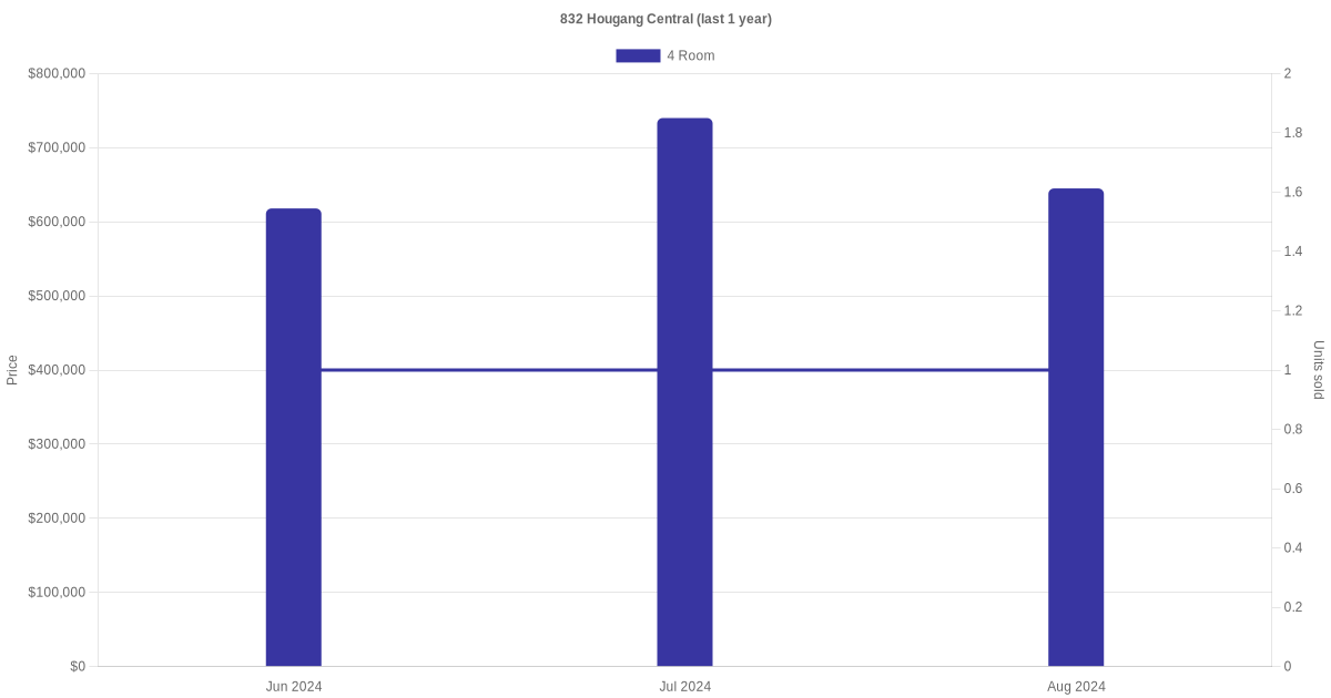 Below is a quick summary of the resale transactions volume and average price trends for the 4 room and 5 room units at 832 Hougang Central.