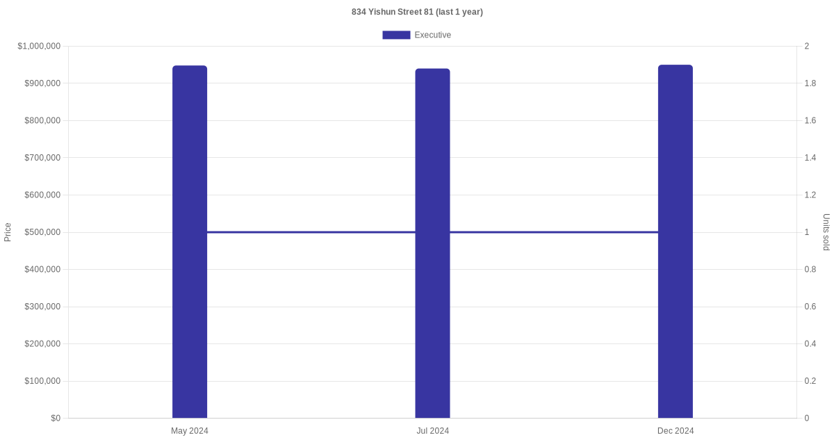 Below is a quick summary of the resale transactions volume and average price trends for the executive units at 834 Yishun Street 81.
