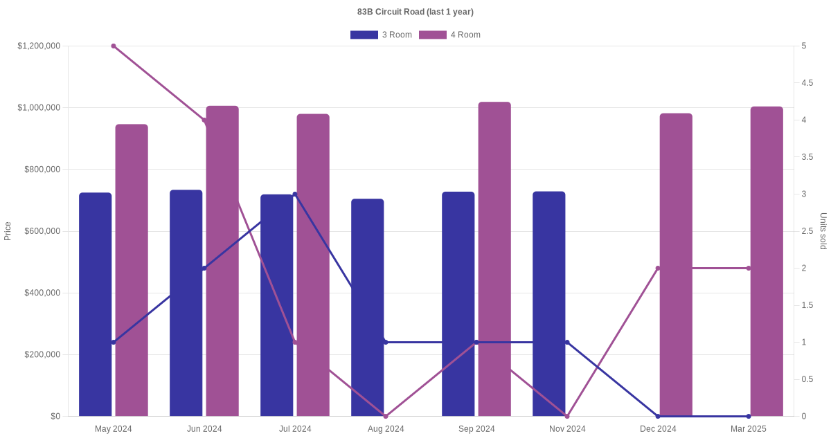 Below is a quick summary of the resale transactions volume and average price trends for the 3 room and 4 room units at 83B Circuit Road.