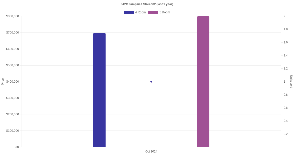 Below is a quick summary of the resale transactions volume and average price trends for the 4 room and 5 room units at 842C Tampines Street 82.