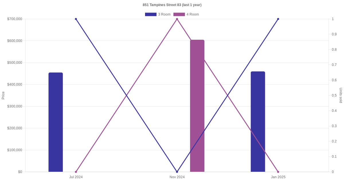 Below is a quick summary of the resale transactions volume and average price trends for the 3 room and 4 room units at 851 Tampines Street 83.
