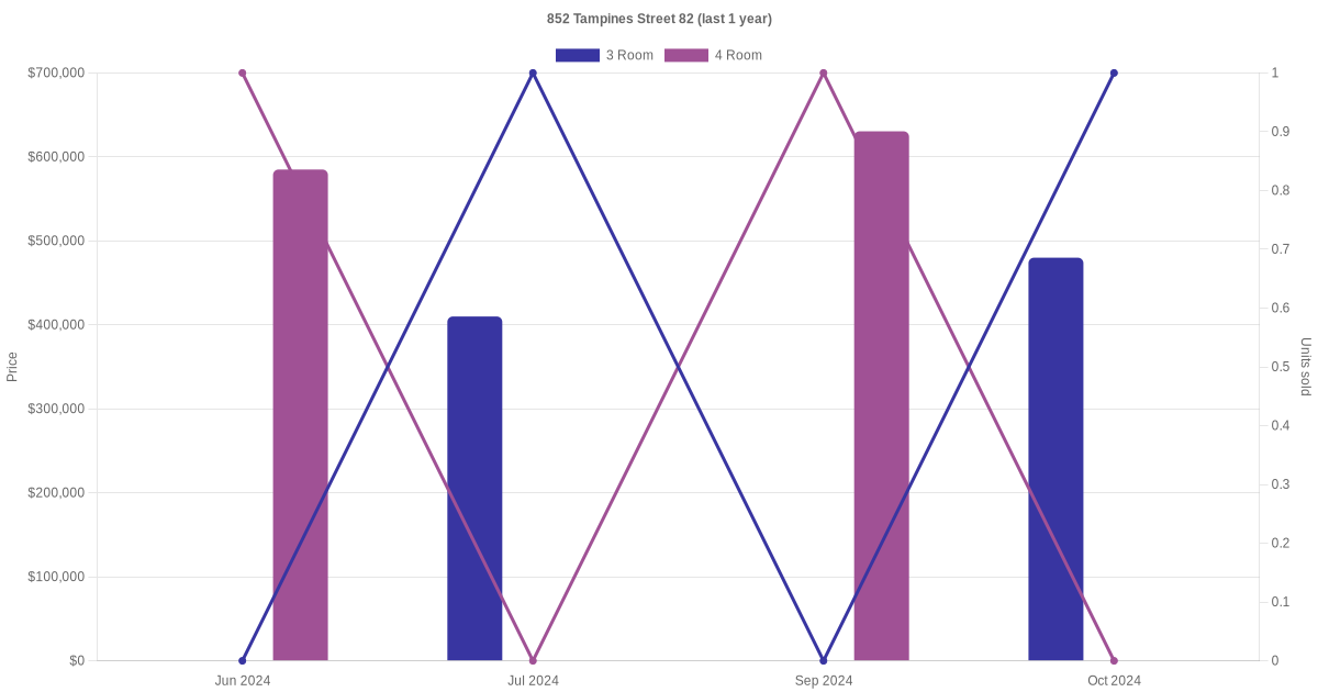 Below is a quick summary of the resale transactions volume and average price trends for the 3 room and 4 room units at 852 Tampines Street 82.