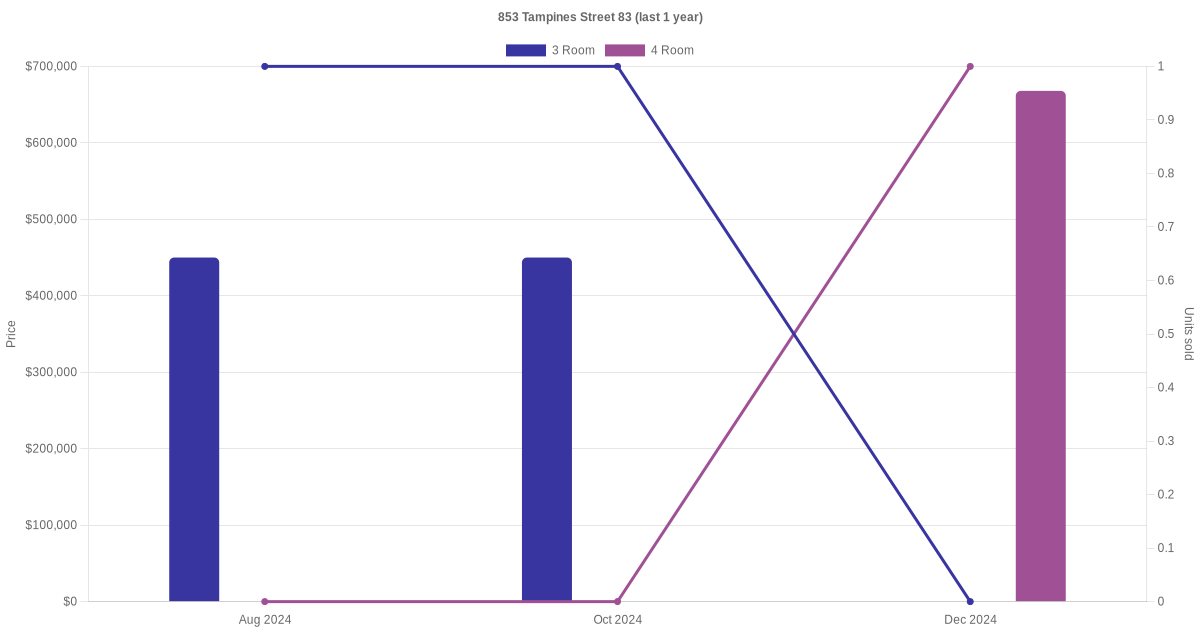 Below is a quick summary of the resale transactions volume and average price trends for the 3 room and 4 room units at 853 Tampines Street 83.