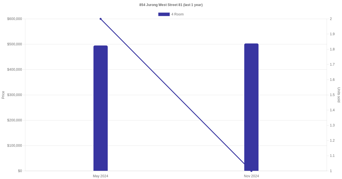 Below is a quick summary of the resale transactions volume and average price trends for the 4 room and 5 room units at 854 Jurong West Street 81.