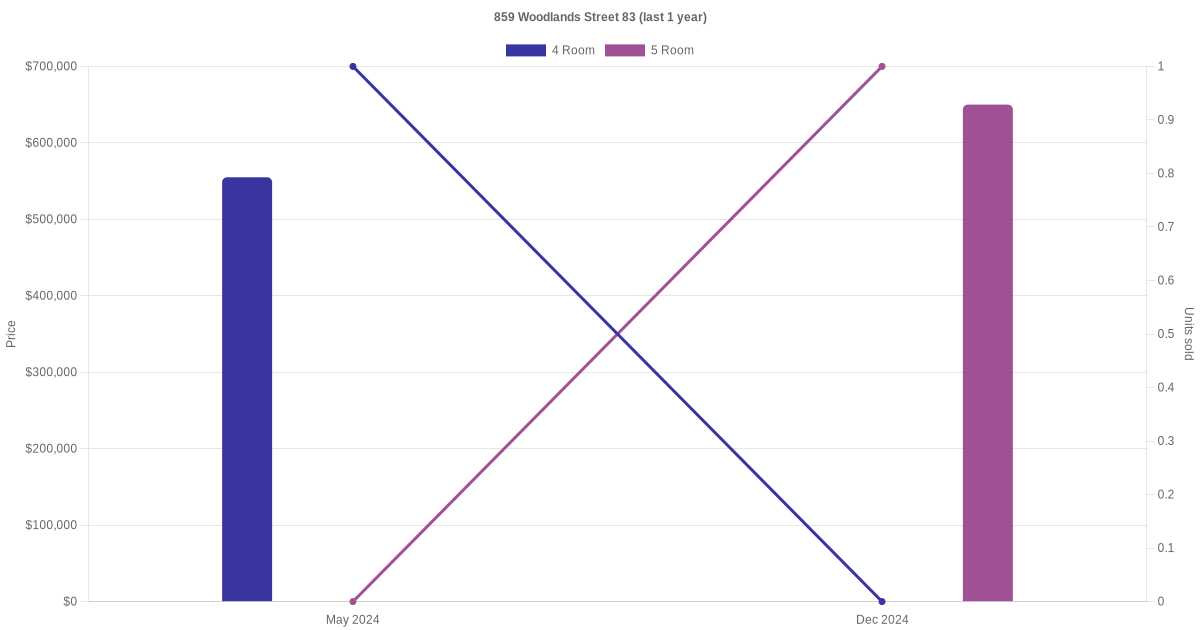 There were a total of 4 resale transactions in the last 3 years for units in block 859 Woodlands Street 83, with the latest one recorded in Dec 2024.