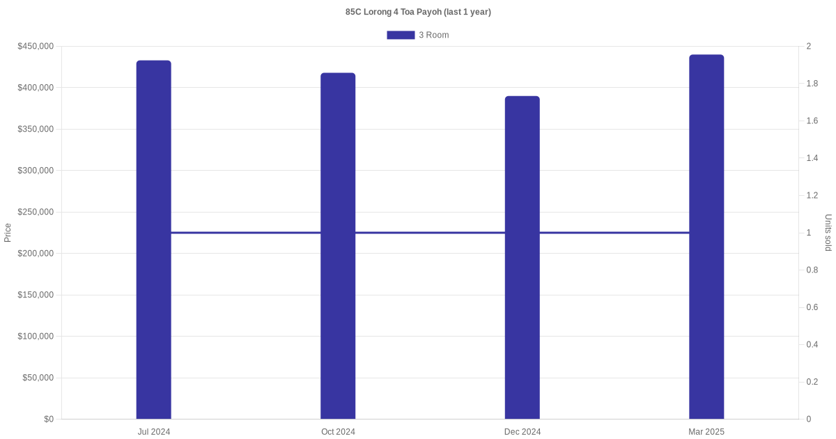 Below is a quick summary of the resale transactions volume and average price trends for the 3 room units at 85C Lorong 4 Toa Payoh.