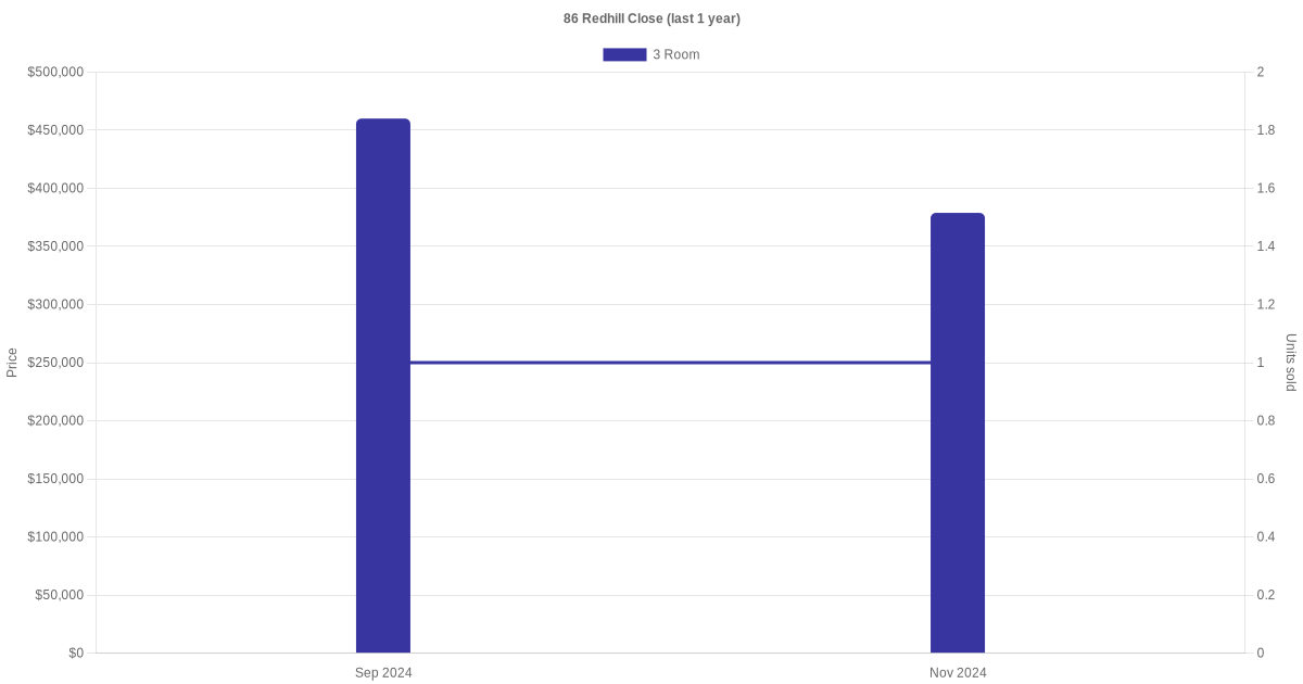 Below is a quick summary of the resale transactions volume and average price trends for the 3 room units at 86 Redhill Close.