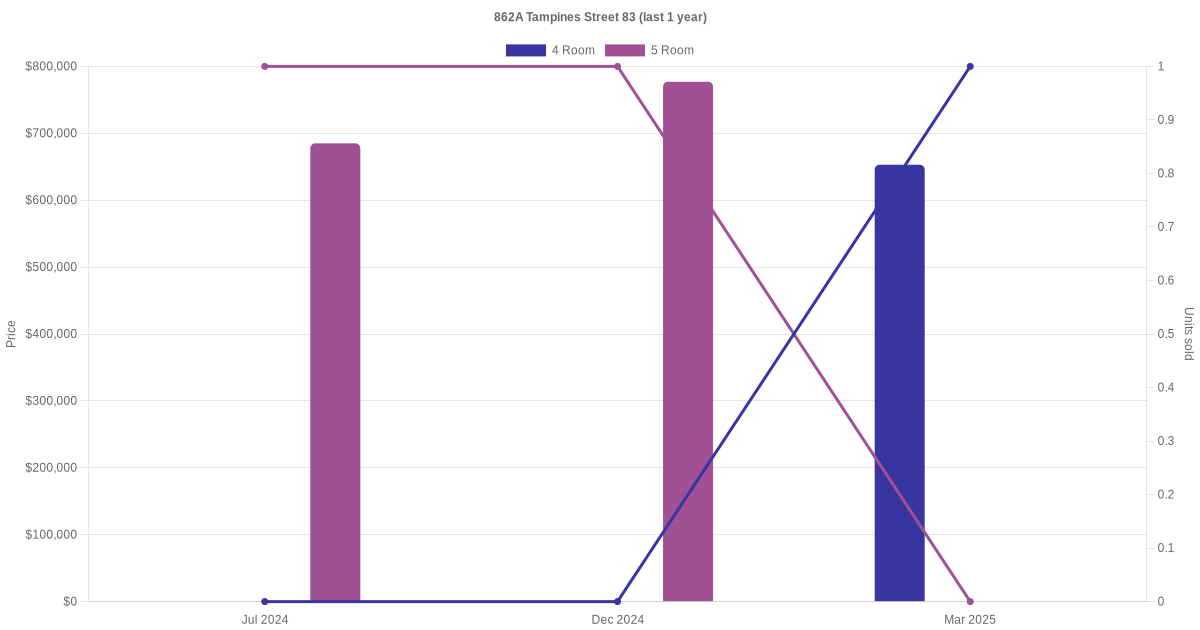 Below is a quick summary of the resale transactions volume and average price trends for the 4 room and 5 room units at 862A Tampines Street 83.