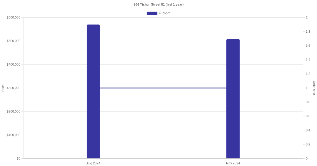 Below is a quick summary of the resale transactions volume and average price trends for the 4 room and 5 room units at 866 Yishun Street 81.