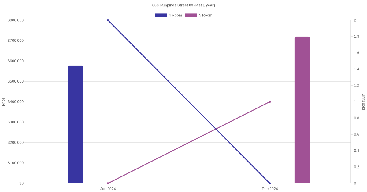 Below is a quick summary of the resale transactions volume and average price trends for the 4 room and 5 room units at 868 Tampines Street 83.