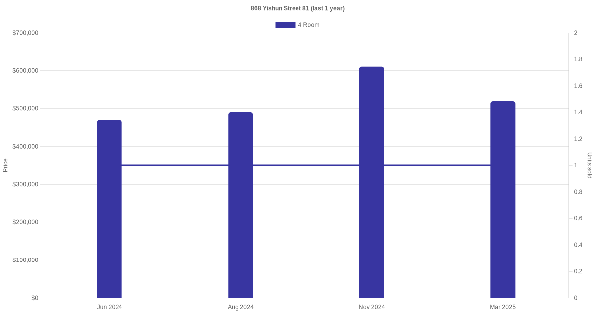Below is a quick summary of the resale transactions volume and average price trends for the 4 room units at 868 Yishun Street 81.