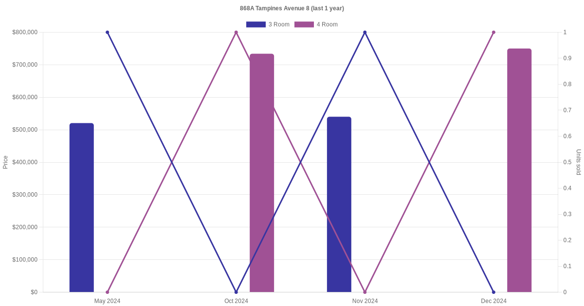 Below is a quick summary of the resale transactions volume and average price trends for the 3 room and 4 room units at 868A Tampines Avenue 8.