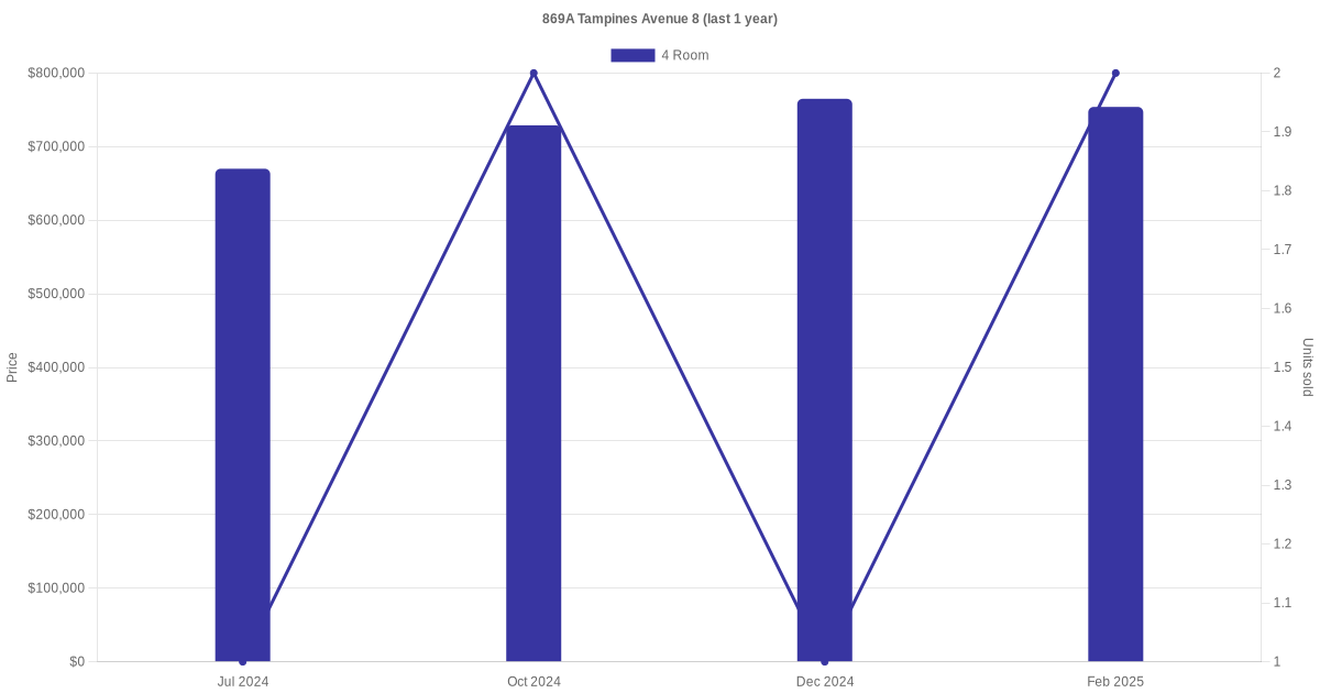 Below is a quick summary of the resale transactions volume and average price trends for the 3 room and 4 room units at 869A Tampines Avenue 8.
