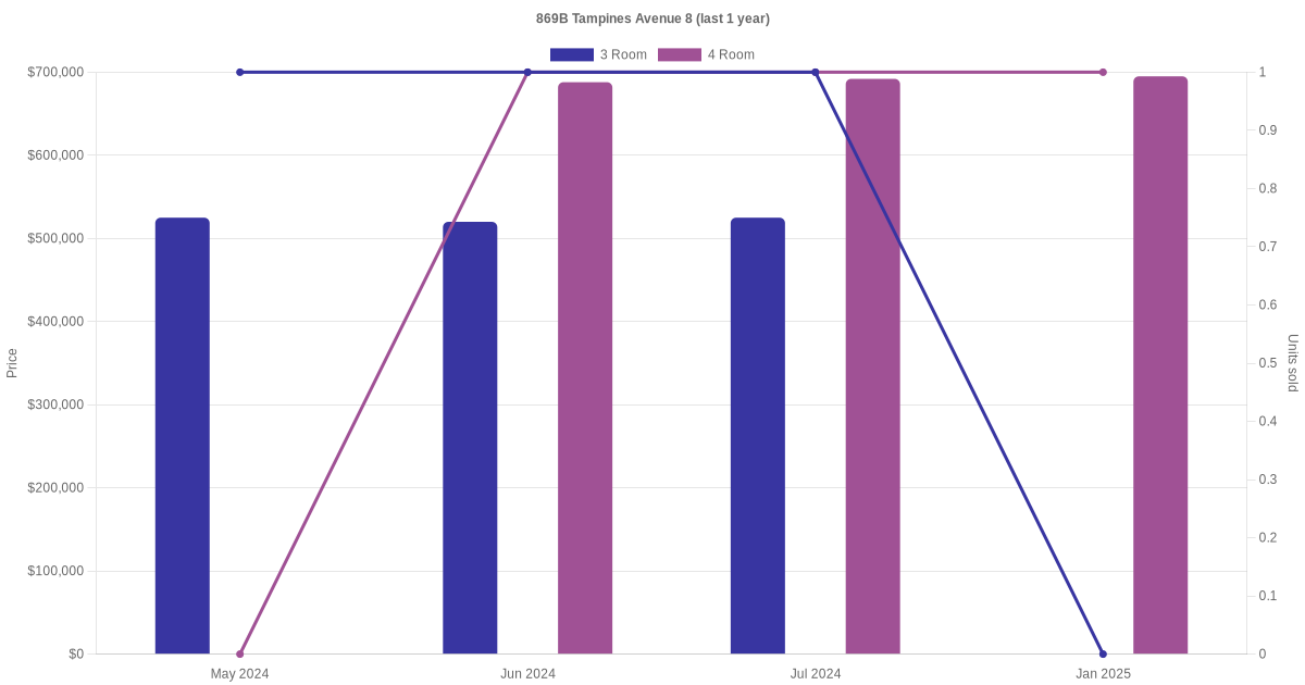 Below is a quick summary of the resale transactions volume and average price trends for the 3 room and 4 room units at 869B Tampines Avenue 8.
