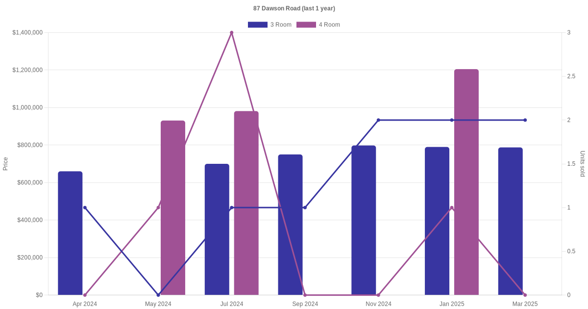 Below is a quick summary of the resale transactions volume and average price trends for the 3 room and 4 room units at 87 Dawson Road.